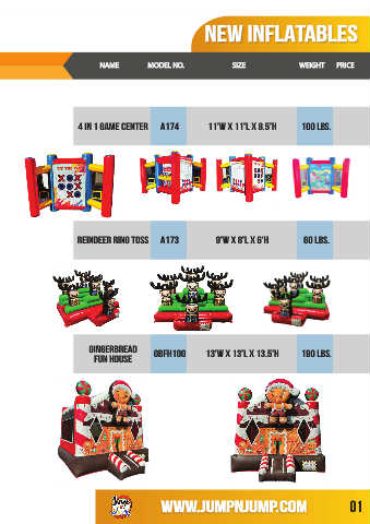 NEW INFLATABLES NAME MODEL NO. SIZE WEIGHT PRICE 4 in 1 GAME CENTER A174 11’W x 11’L x 8.5’H 100 lbs. REINDEER RING TOSS A173 9’W x 8’L x 6’H 60 lbs. GINGERBREAD FUN HOUSE GBFH100 13’W x 13’L x 13.5’H 190 lbs. WWW.JUMPNJUMP.COM 01