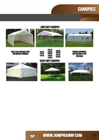 Canopies Light Duty Canopies 20x20 Walls are available with 10x10 20x30 30x30 Paredes disponible 30x40 and without windows 10x20 20x40 30x50 con ventanas o sin 10x30 20x50 ventanas 20x60 30x60 Heavy Duty Canopies WWW.JUMPNJUMP.COM 45
